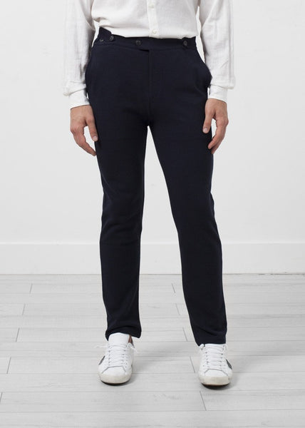 The Bali Pant is a classic look with pleasing stretch. Side angled pockets at front. Addible waistband with zip fly closure. Homecore. Color Navy. 100% Cotton. Made in Portugal. Matt is wearing a Large. Matt is 6’2”, Chest 38”, Waist 31”, Inseam 34.5”.